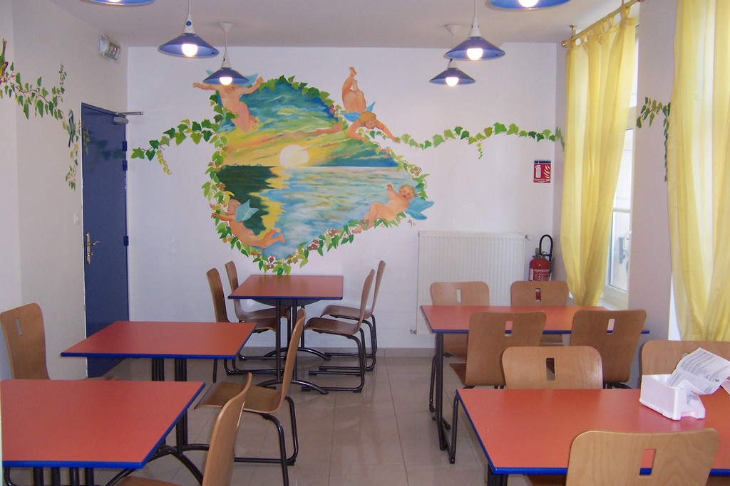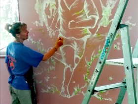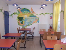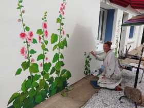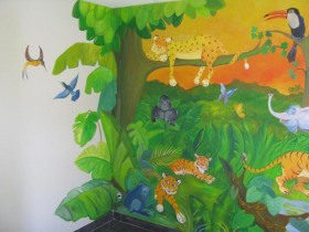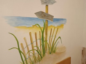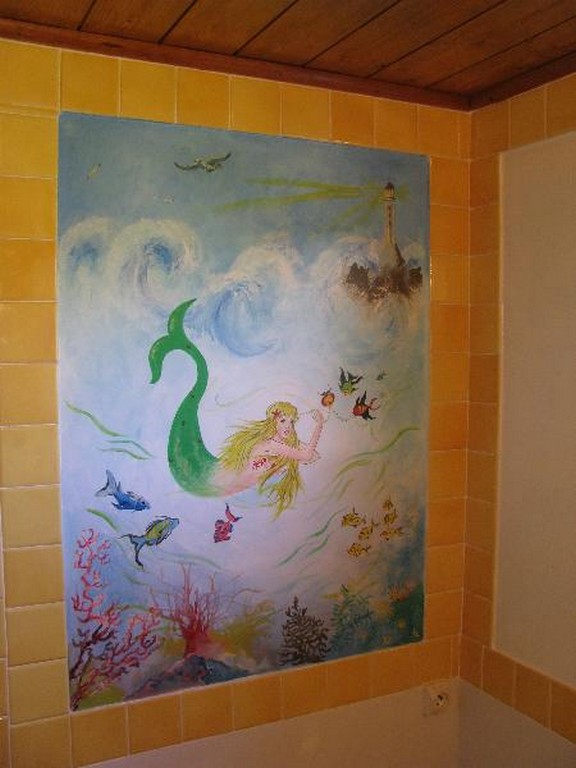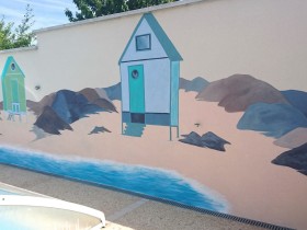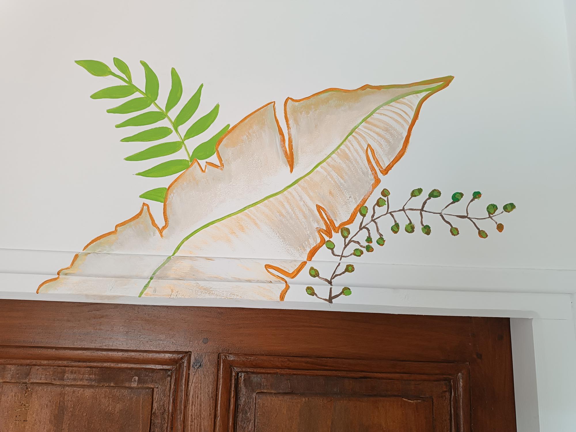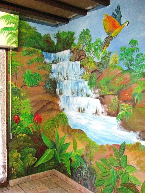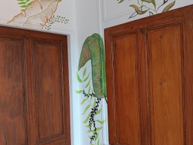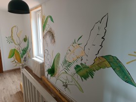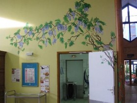 Décorer avec une frise, un élément décoratif sur le fond d’origine ou un mur totalement, pour camoufler, agrandir l’espace, oublier un angle, illuminer un espace, ici des exemples de décorations murales pour montée d’escalier, couloir, salon, commerce, salle de réception ou sportive.